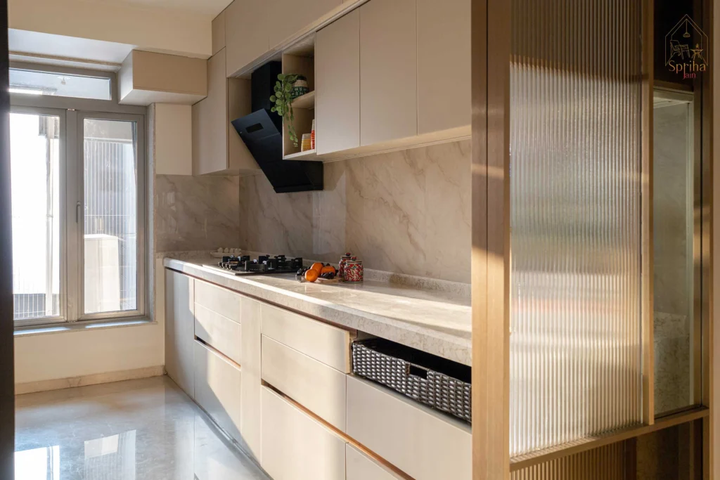 Kitchens in cities like Mumbai are frequently small and disorganized. Not in this place. This kitchen features a sophisticated grey-and-white tone with a modular design. The kitchen’s matte laminate finishes, concealed knobs, and quartz worktops make it streamlined, practical, and low maintenance.