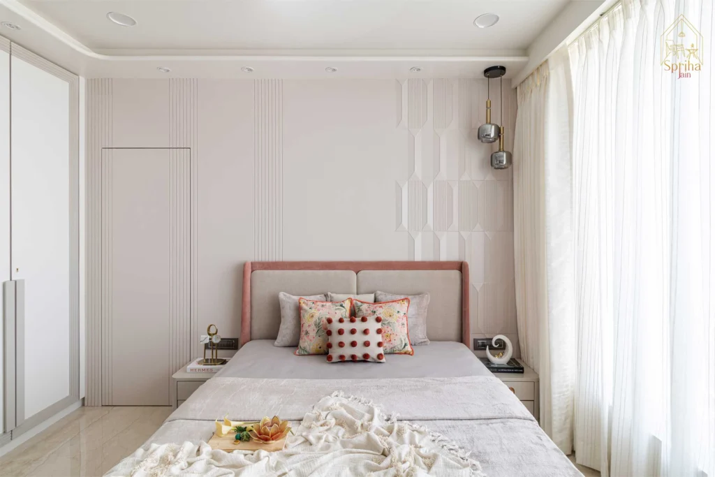 The master bedroom is like a soft breath out. Its soft curtains, pastel walls, and carefully selected textures are all intended to promote total relaxation. Behind the bed, the accent wall has delicate paneling that adds visual interest without taking over the room.