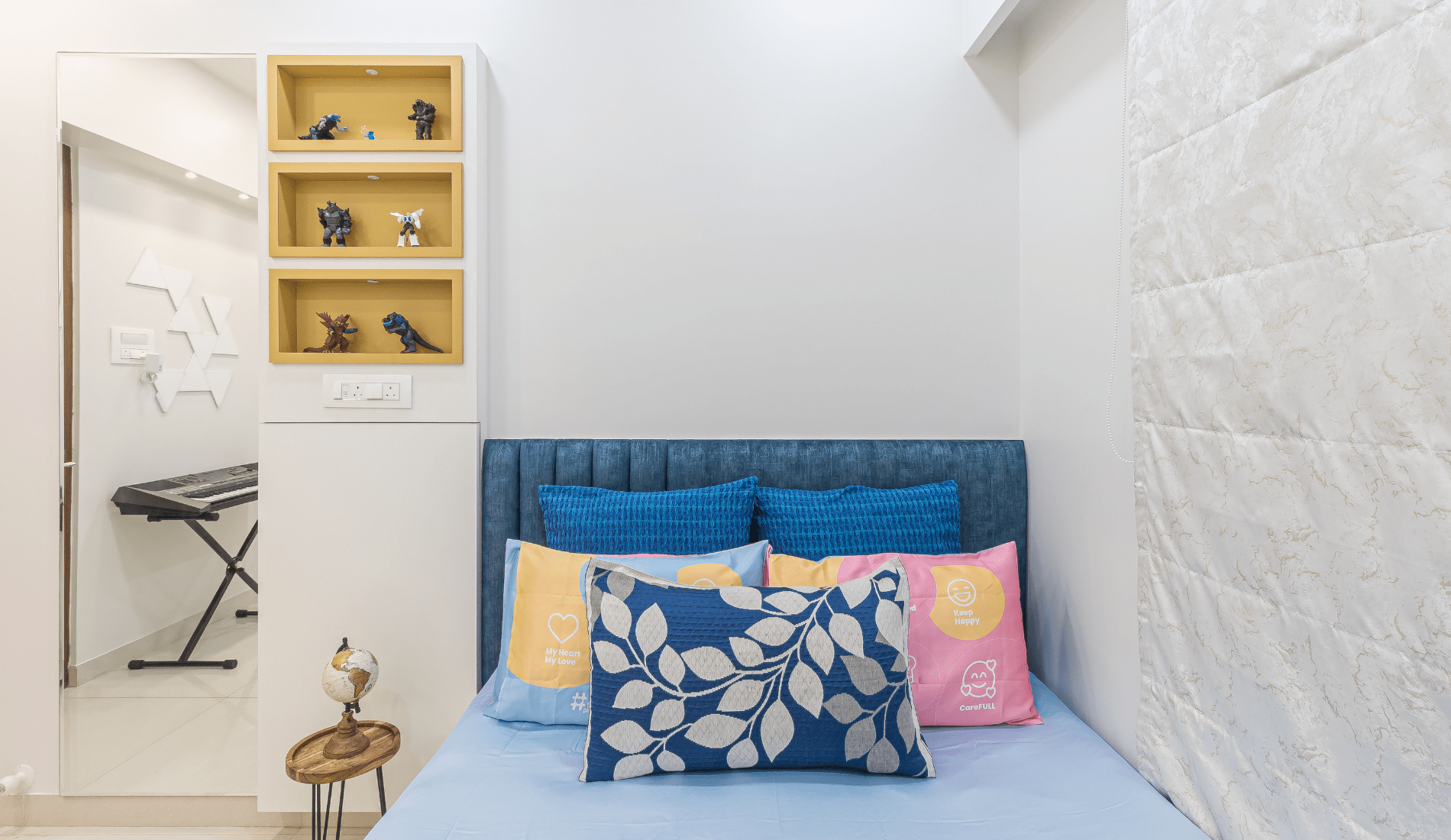 Veneer table tops and almirahs were beautifully hand painted with classy mandala butta. A wooden chair and a jhumar with warli art and colourful ropes and bulbs were handmade exclusively for the client. A comfortable staircase was created withsufficient space for clothing display. We achieved a nice blend of vintage and trendy ethnic look for the store. A warli art wall décor (forming an S) looked like the cherry on top.